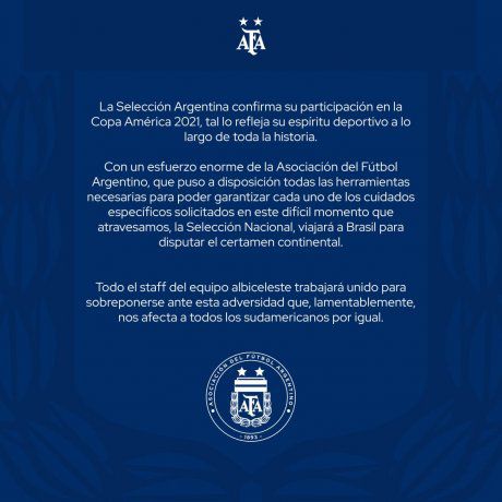 La Asociación del Fütbol Argentino emitió un comunicado en el que confirma la participación de la Selección en la Copa América 2021 que se disputará en Brasil. El anuncio coincide con la rebelión de los futbolistas de los locales a la que se acoplarían todos los planteles. El país designado como sede, es el tercero más golpeado por la pandemia de coronavirus.