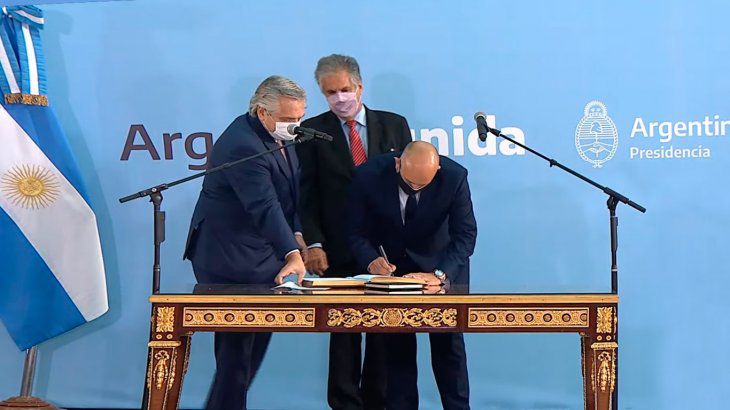 Del acto, que se desarrolló en el Museo del Bicentenario, participaron el jefe de Gabinete, Santiago Cafiero, y los ministros de Interior, Eduardo de Pedro; de Economía, Martín Guzmán; de Obras Públicas, Gabriel Katopodis; de las Mujeres, Géneros y Diversidad, Elizabeth Gómez Alcorta; y de Desarrollo Social, Daniel Arroyo y la presidenta de AySA, Malena Galmarini, entre otras autoridades.