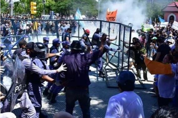 Si bien las protestas comenzaron ayer por la noche en la puerta de la gobernación, este mediodía la situación se puso más tensa con la aparición de los efectivos de seguridad, que intentaron que los manifestantes depusieran su actitud con palazos, balas de goma y gases lacrimógenos.