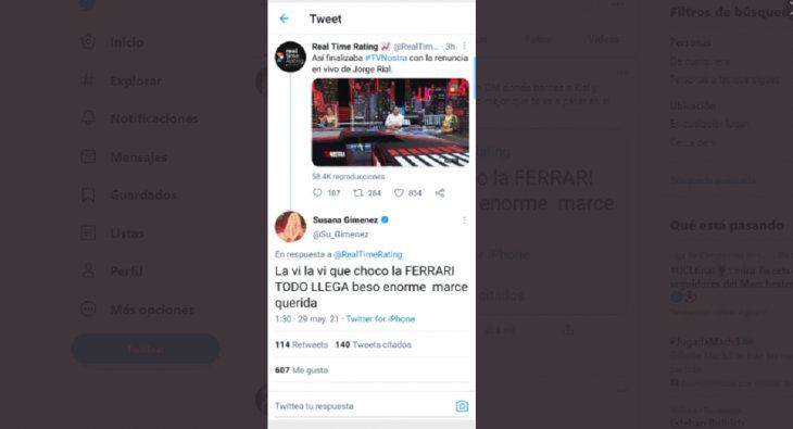 «La vi, la vi, que chocó la Ferrari. Todo llega beso enorme Marce querida», expresó Su, haciendo referencia al vehículo que mencionó el periodista en su discurso. Este mensaje fue tendencia en la red social del pajarito.