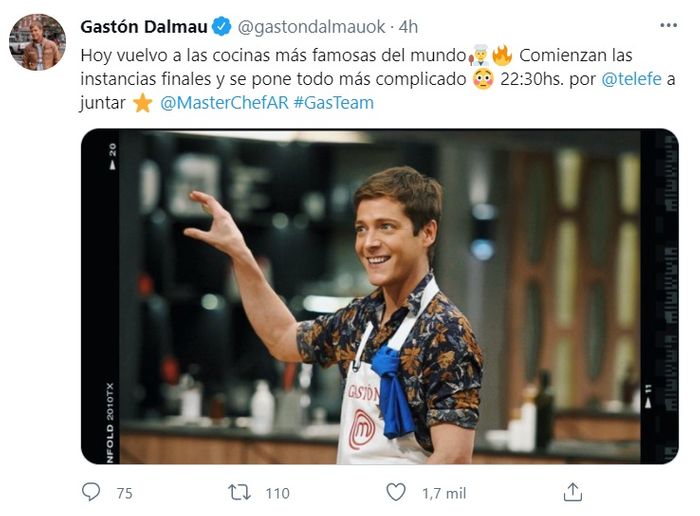 «Hoy vuelvo a las cocinas más famosas del mundo Comienzan las instancias finales y se pone todo más complicado 22:30hs. por @telefe a juntar @MasterChefAR #GasTeam», escribió Gastón en su cuenta de Twitter.