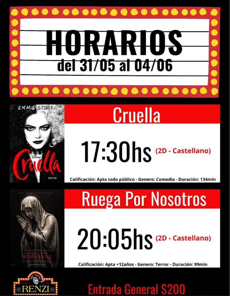 El Cine Teatro Municipal Renzi presentará las películas “Cruella” y “Ruega por nosotros” que serán proyectadas con el 30 % de la capacidad de la sala desde el lunes 31 hasta el viernes 4. En consonancia con las nuevas medidas dispuestas desde el Gobierno Provincial para prevenir los contagios de COVID-19 se restringirán los días y horarios de las proyecciones.