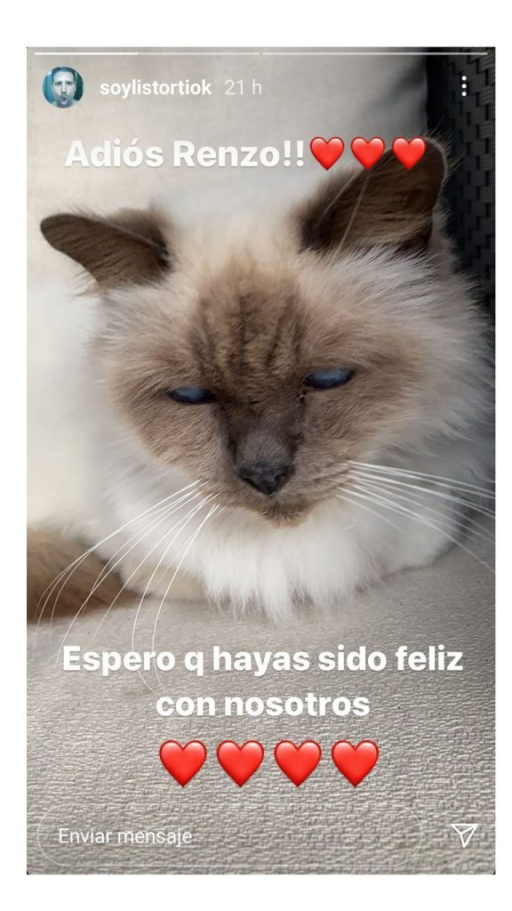 En una de sus historias, el humorista compartió una foto del animalito y escribió junto a varios corazones: “¡Adiós Renzo! Espero que hayas sido feliz con nosotros”. Y su esposa, en tanto, hizo lo propio con otra imagen en la que se veía al gatito en su regazo y agregó: “Renzo, así siempre en nuestro corazón. Gracias por tu tiempo en nuestras vidas. Nos hiciste muy feliz”.