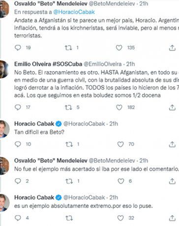 Los comentarios repudiando el tuit no se hicieron esperar. “Andate a Afganistán si te parece un mejor país, Horacio. Argentina tendrá inflación, tendrá a los kirchneristas, será inviable, pero al menos no hay terroristas”, le escribieron desde la cuenta de Osvaldo Beto Mendeleiev. Otro usuari identificado como Emilio Olveira le respondió al seguidor siguiendo los argumentos de Cabak.