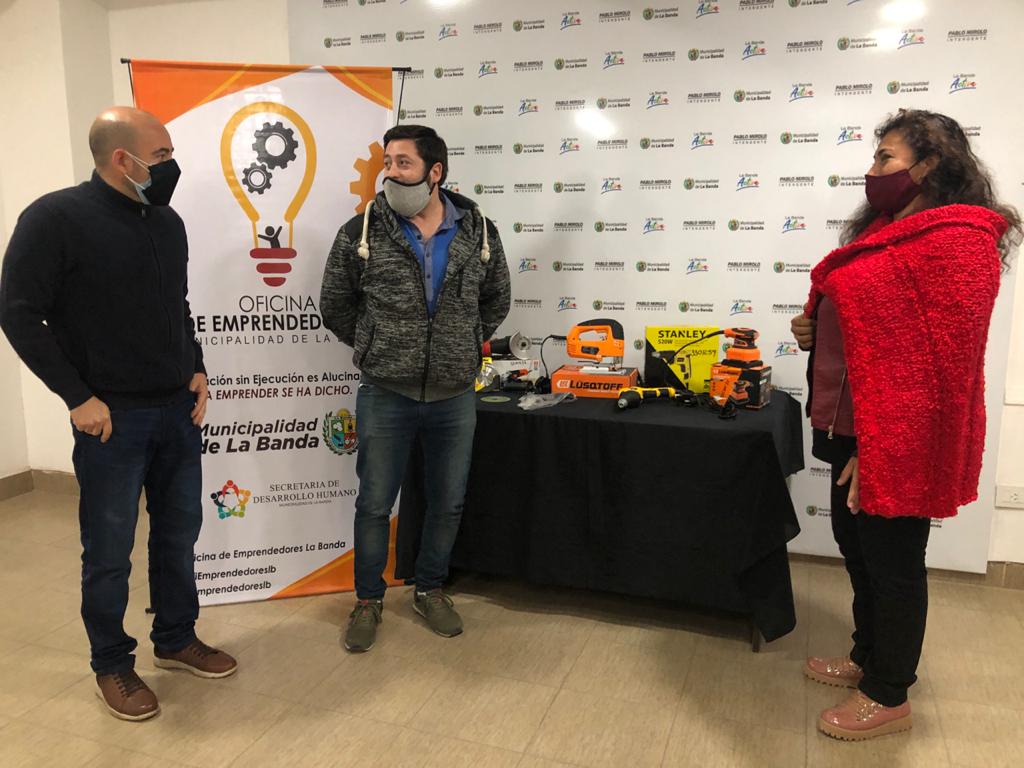Finalmente, su pedido fue aprobado y el jefe comunal realizó la entrega oficial de un taladro atornillador, una amoladora, una lijadora oval, una sierra caladora y discos de corte.