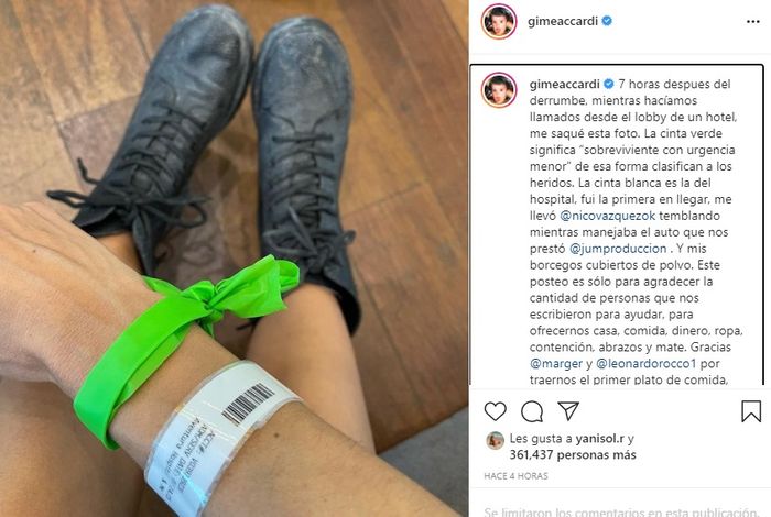 «7 horas después del derrumbe, mientras hacíamos llamados desde el lobby de un hotel, me saqué esta foto. La cinta verde significa “sobreviviente con urgencia menor” de esa forma clasifican a los heridos. La cinta blanca es la del hospital, fui la primera en llegar, me llevó @nicovazquezok temblando mientras manejaba el auto que nos prestó @jumproduccion . Y mis borcegos cubiertos de polvo», comenzó la actriz su fuerte mensaje.