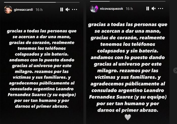 Y cerró: «Estamos como se puede estar en una situación así. Ya estaremos bien y seguiremos honrando la vida como siempre, sólo que ahora podemos contar un milagro en primera persona. Volvimos a nacer. Todo nuestro amor y fuerzas a los familiares de las víctimas fatales, los abrazamos con el alma».