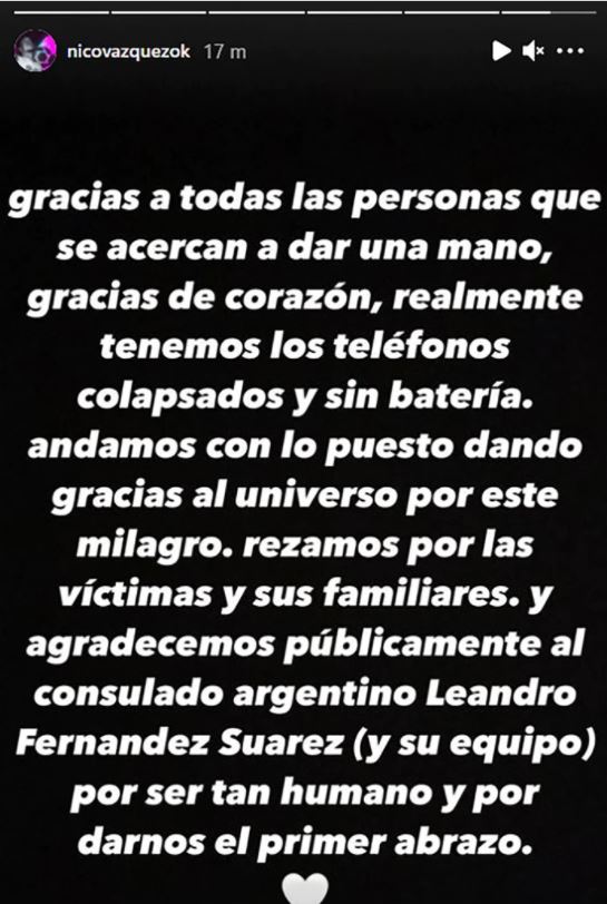 Shokeados por el episodio que acababan de vivir, los actores solo atinaron a avisar por la mañana que afortunadamente se encontraban bien, y luego, minutos antes de las seis de la tarde, ambos volcaron sus sensaciones en sus historias de Instagram. “Gracias a todas las personas que se acercan a dar una mano, gracias de corazón, realmente tenemos los teléfonos colapsados y sin batería. Andamos con lo puesto dando gracias al universo por este milagro. Rezamos por las víctimas y sus familiares, y agradecemos públicamente al consulado argentino Leandro Fernández Suárez (y su equipo) por ser tan humano y darnos el primer abrazo”. reza el comunicado que replicaron ambos.