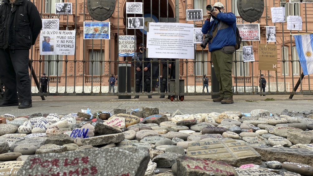 Un homenaje a las víctimas mortales que dejó la pandemia de coronavirus se llevó a cabo hoy en la Plaza de Mayo y frente a la Residencia oficial de Olivos, donde los asistentes dejaron piedras grabadas con los nombres de muchos de los fallecidos.