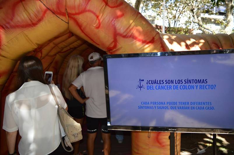 La muestra, que contó con el apoyo del Área de Oncología de Merck, compañía alemana de ciencia y tecnología, cuenta con monitores que proyectan videos y está compuesta por un colon inflable gigante dispuesto en forma de túnel, al que las personas pueden ingresar y recorrer mientras se informan acerca de los distintos estadios de la enfermedad, la importancia de la detección precoz y las alternativas de estudios diagnósticos.