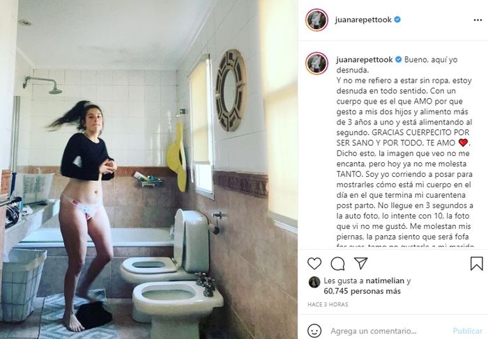 «Bueno, aquí yo desnuda. Y no me refiero a estar sin ropa, estoy desnuda en todo sentido. Con un cuerpo que es el que AMO por que gesto a mis dos hijos y alimento más de 3 años a uno y está alimentando al segundo. GRACIAS CUERPECITO POR SER SANO Y POR TODO. TE AMO», comenzó Juana su mensaje.