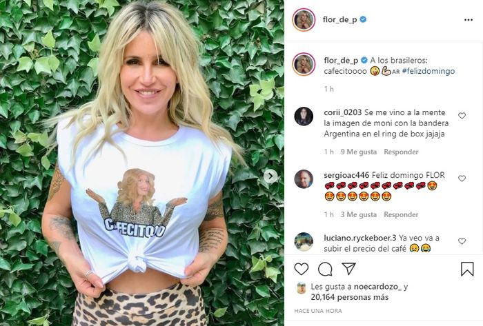Y ya el domingo, se mostró con una remera con la imagen de Moni Argento, personaje que interpretó en «Casados con hijos», y su recordada frase «cafecito».
