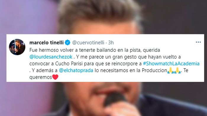En su cuenta de Twitter, Marcelo Tinelli publicó un mensaje para hacer referencia a la salida de El Chato y Lourdes Sánchez. «Fue hermoso volver a tenerte bailando en la pista, querida @lourdesanchezok . A @elchatoprada lo necesitamos en la producción. Te queremos», dijo el conductor.