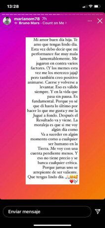 «Mi amor, buen día hija. Te amo, que tengas un lindo día. Esta vez, debo decir que mi performance fue muy mala, lamentablemente. Me jugaron en contra varios factores. Y los memes esta vez me los merezco ja, ja, ja», expresó.