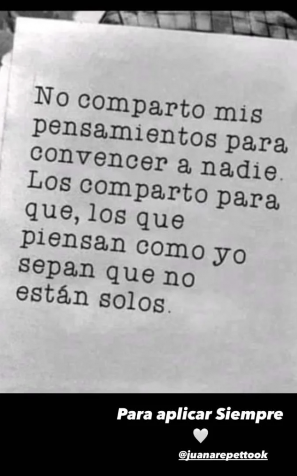 A través de sus stories de Instagram, la conductora le dedicó una significativa reflexión. «No comparto mis pensamientos para convencer a nadie. Los comparto para que, los que piensan como yo, sepan que no están solos», fue el mensaje que replicó Paula etiquetando a Juana. Y sumó: «Para aplicar siempre».