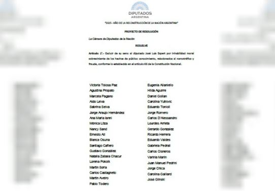 El documento presentado solicita «excluir» de la Cámara baja a Espert, quien también preside la Comisión de Presupuesto del recinto, «por inhabilidad moral sobreviniente de los hechos de público conocimiento, relacionados al narcotráfico y fraude, conforme lo establecido en el artículo 66 de la Constitución Nacional«.