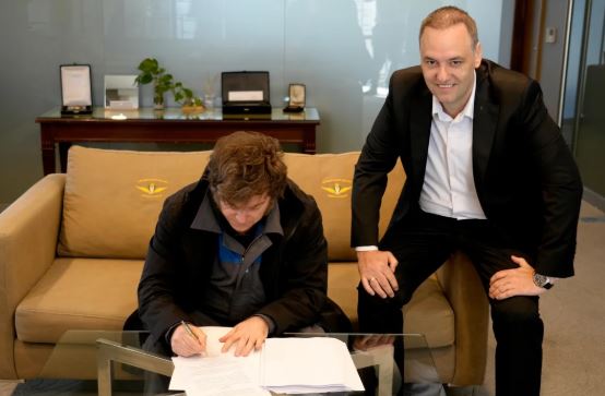 Desde la Presidencia hicieron público un video en el que se lo ve al mandatario firmar el detalle de la reforma musicalizado por la canción «Back in Business» de AC/DC, en el que se lo escucha expresar: “Por más crecimiento, más prosperidad, por más trabajo y para que la Argentina sea grande nuevamente. ¡Viva La Libertad, carajo!”. Se muestra escoltado por el jefe de Gabinete, Manuel Adorni.