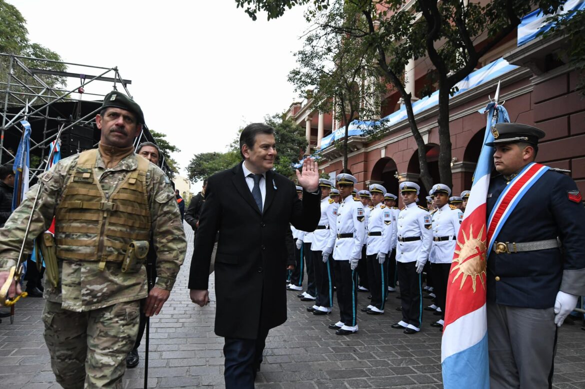 Las actividades conmemorativas comenzaron con el izamiento de la Bandera Nacional, a cargo del vicegobernador acompañado por el jefe de Gabinete, la intendente y el presidente del Poder Judicial.