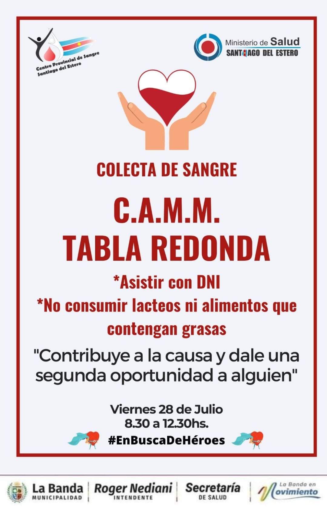 La Secretaría de Salud de la Municipalidad de La Banda, a través del Centro de Atención Médica Municipal (CAMM) N° 1 del barrio Tabla Redonda realizará una nueva colecta de sangre y actualizará el Registro de donantes de médula ósea.